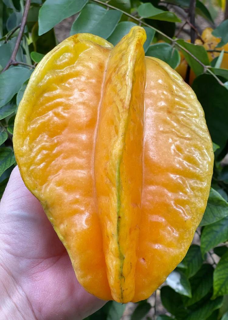 The Fruit is larger than the other varieties. With a bright yellow and orange color(when ripe) and a crisp and crunchy but extremely juicy flesh it is a wonderful fruit to munch on. With a sweet and tart flavor it is great for those who like that balance of flavor and sweetness. Full of vitamins and antioxidants this fruit is not only yummy but healthy. Slicing the fruit gives the pieces a star shape hence the name.