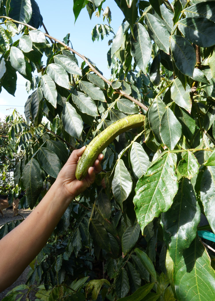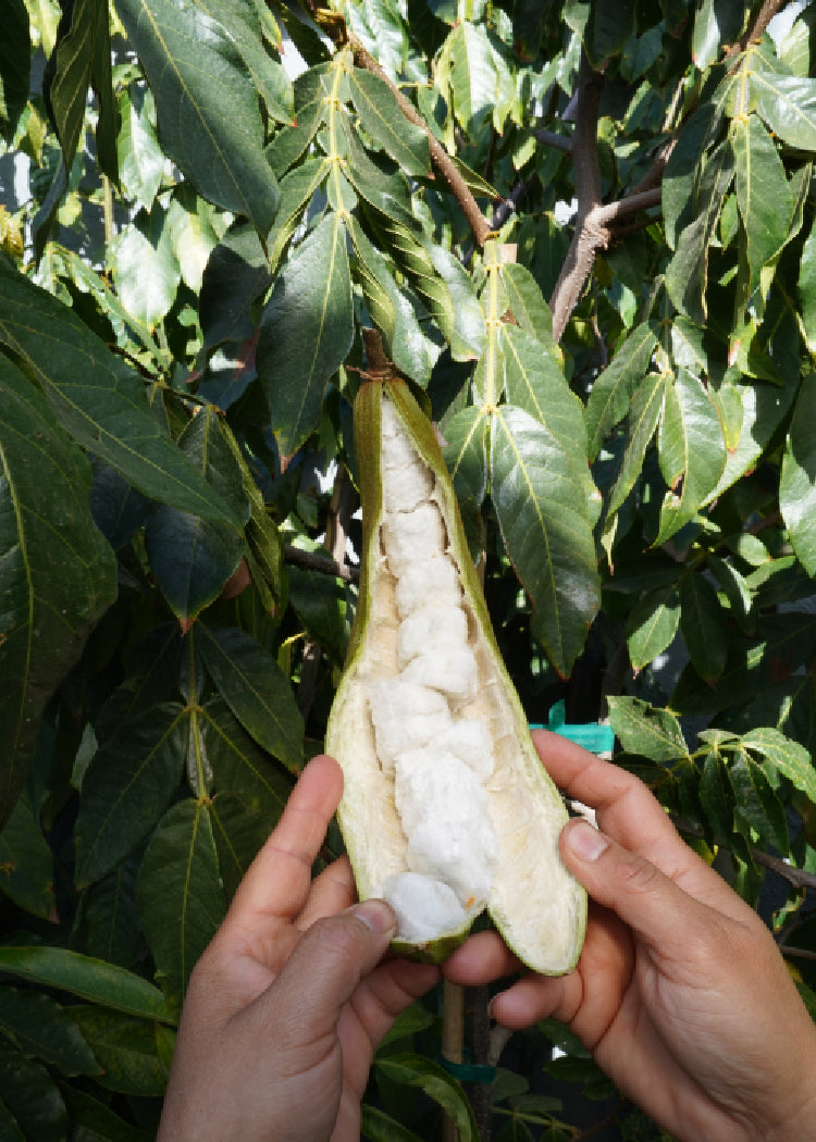 Ice Cream Beans are the cotton candy of nature! The fruits are long thin pods and inside those pods is white cotton candy wrapped around black seeds. What you eat is the white fluff and it tastes like vanilla with sugar, a little like vanilla ice cream. A very different and unique experience that everyone who has tasted it can agree with.
